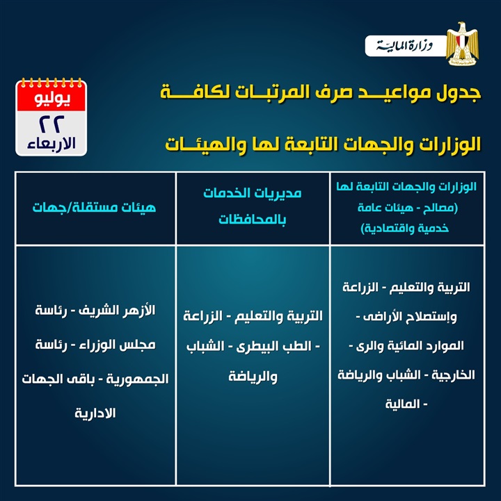 وتشمل الوزارات التي ستصرف رواتبها اليوم الأربعاء، كلا من "التربية والتعليم،الزراعة واستصلاح الأراضي،الموارد المائية، الخارجية، الشباب والرياضة، المالية"، والجهات التابعة لها.