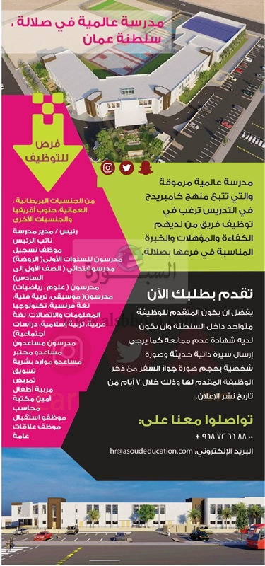 تعلن مدرسة صلالة العمانية عن وظائف جديدة للمعلمين والمعلمات وفقا لنص الإعلان التالي:-