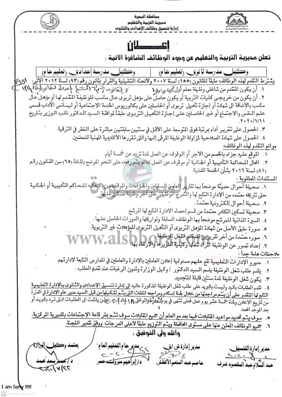 التعليم تعلن حاجتها الى وكلاء مدارس ثانوى عام واعدادى.. مستند