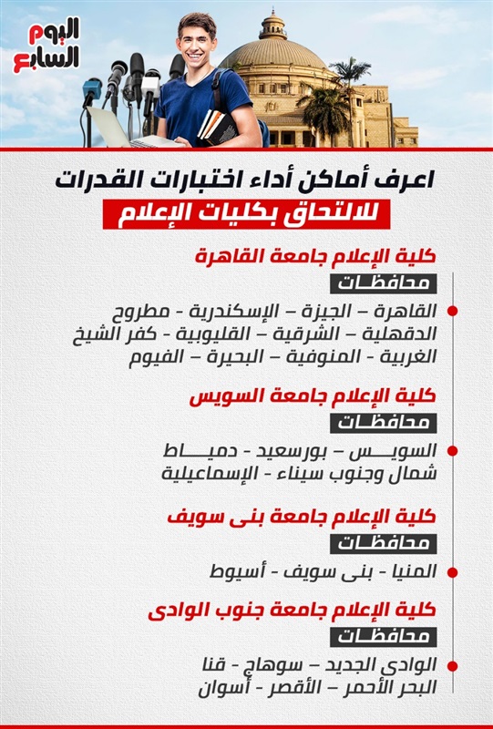 وفيما يلى الأماكن التى حددتها وزارة التعليم العالى لأداء اختبارات القدرات للطلبة الراغبين فى الالتحاق بكليات الإعلام.