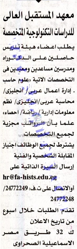 برواتب مجزية.. معهد المستقبل العالى يعلن حاجته الى اعضاء هيئة التدريس من المدرسين المساعدين والمعيدين