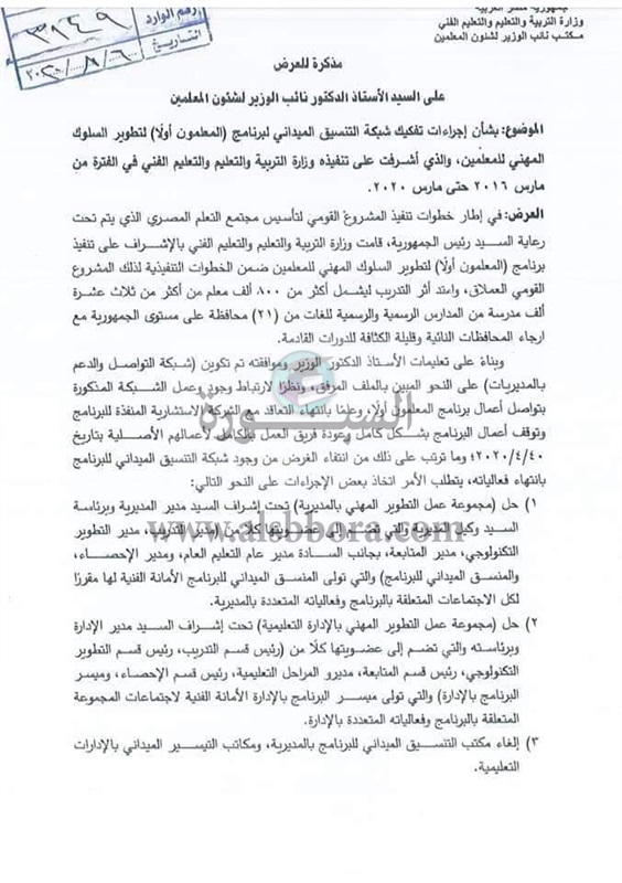 الغاء مكتب التنسيق الميدانى للبرنامج بالمديرية ومكاتب التيسير الميدانى بالادارات التعليمية.