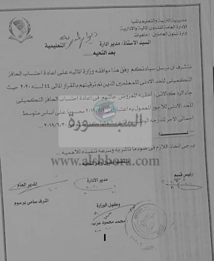 وجاء فى الخطاب الموجه من الادارة العامة للشئون المالية لمديرية التربية والتعليم الى جميع الادارات التعليمية "نتشرف ان نرسل لسيادتكم وفق هذا موافقة وزارة المالية على اعادة احتساب الحافز التكميلى للحد الادنى للمعلمين الذين تم ترقيتهم بالقرار المالى 44 لسنة 2020، حيث جاء الرد كالاتى: احقية المعروض حالتهم فى اعادة احتساب الحافز التكميلى للحد الادنى للاجور المعمول به اعتبارا من اول يوليو 2019 محسوبا على اساس متوسط اجمالى الاجر للدرجة الوظيفية التى يشغلها كل منهم فى 30 يونيو 2019".