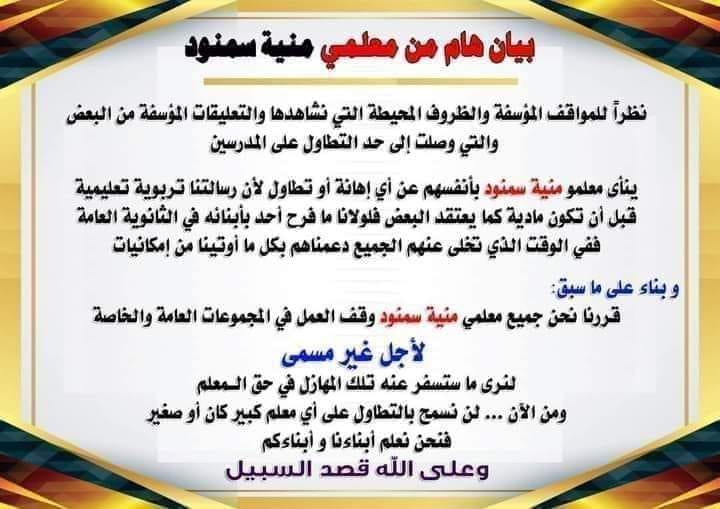 وجاء البيان "نظرا للمواقف والظروف المحيطة التى نشاهدها والتعليقات المؤسفة من البعض والتى وصلت الى حد التطاول على المدرسين، ينأى معلمو سمنود بانفسهم عن اى اهانة او تطاول لان رسالتنا تربوية تعليمية قبل ان تكون مادية كما يعتقد البعض، فلولانا ما فرح احد بابنائه فى الثانوية العامة ففى الوقت الذى تخلى عنهم الجميع دعمناهم بكل ما اوتينا من امكانيات، وبناء على ما سبق قررنا نحن جميع معلمى منية سمنود وقف العمل فى المجموعات العامة والخاصة لاجل غير مسمى، لنرى ما ستسفر عنه تلك المهازل فى حق المعلم، ومن الآن لن نسمح بالتطاول على اى معلم كبير كان او صغير، فنحن نعلم ابناءنا وابناءكم".