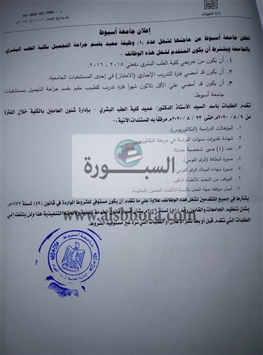تعلن جامعة أسيوط عن وظائف جديدة لأعضاء هيئة التدريس علما بأن أخر موعد للتقديم يوم الأحد 23 أغسطس وفقا لنص الإعلان التالي: