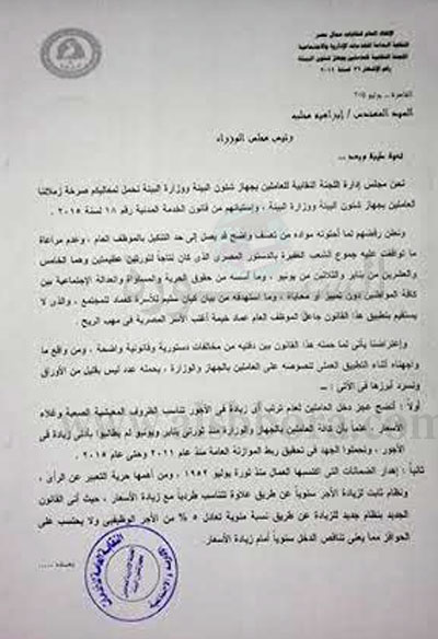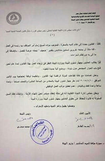 أعلنت نقابة العاملين بجهاز شئون البيئة ووزارة البيئة رفضها واستيائها من قانون رقم 18 لسنة 2015 المعروف بالخدمة المدنية وارسلت كتاب مبلغ لوزير البيئة ولرئيس مجلس الوزراء تعلن وبالاسباب رفضها للقانون واعتزامها لتنظيم تظاهرة في العاشر من أغسطس.