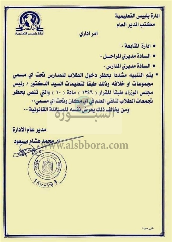 اصدرت ادارة بلبيس التعليمية التابعة لمديرية التربية والتعليم بمحافظة الشرقية امرا اداريا الى جميع مديرى المدارس بكافة المراحل التعليمية بشأن عدم دخول الطلاب الى المدارس نهائيا.