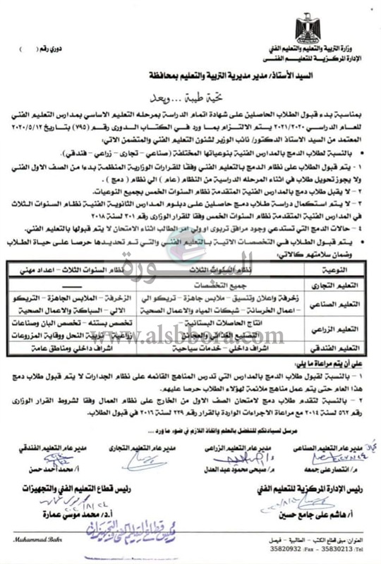 مع بدء قبول الطلاب الحاصلين على شهادة إتمام الدراسة بمراحل التعليم الأساسى للمدارس التعليم الفنى للعام الدراسى الجديد 2020/ 2021 يتم الالتزام بما ورد فى الكتاب الدورى رقم 195 بتاريخ 13/5/2020 والمعتمد من الدكتور نائب الوزير لشؤون التعليم الفنى .