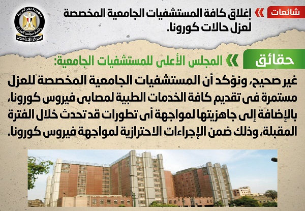 كشف مركز المعلومات بمجلس الوزراء عن الاخبار المتداولة بشأن اغلاق كافة المستشفيات الجامعية المخصصة لعزل حالات كورونا.