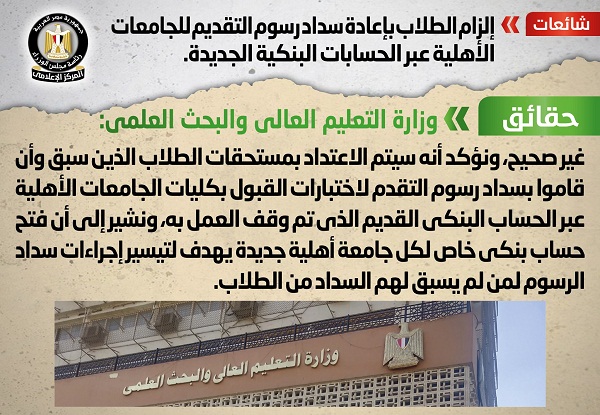 كشف المركز الاعلامي لمجلس الوزراء ما تداولته بعض وسائل الإعلام والمواقع الإلكترونية وصفحات التواصل الاجتماعي بشأن إلزام الطلاب بإعادة سداد رسوم التقديم للجامعات الأهلية عبر الحسابات البنكية الجديدة.