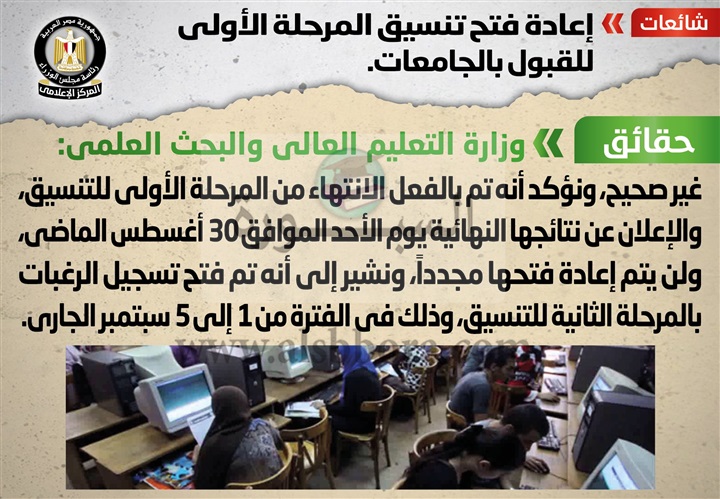 حيث نفت وزارة وزارة التعليم العالي والبحث العلمي،ما تردد من أنباء بشأن إعادة فتح تنسيق المرحلة الأولى للقبول بالجامعات، مُؤكدةً أنه لا صحة لإعادة فتح تنسيق المرحلة الأولى للقبول بالجامعات، موضحةً أنه تم بالفعل الانتهاء من المرحلة الأولى للتنسيق، والإعلان عن نتائجها النهائية يوم الأحد الموافق 30 أغسطس الماضي، ولن يتم إعادة فتحها مجدداً، مشيرةً إلى أنه تم فتح تسجيل الرغبات بالمرحلة الثانية للتنسيق، وذلك في الفترة من
