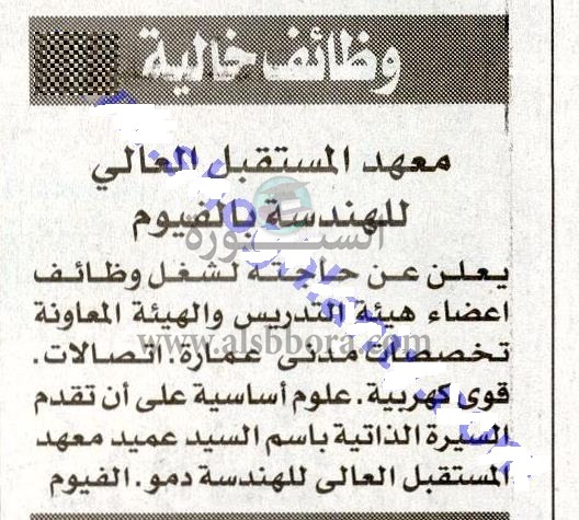 يعلن معهد المستقبل العالى للهندسة بالفيوم عن حاجته الى اعضاء هيئة التدريس ومعاونيهم فى التخصصات: مدنى عمارة، اتصالات، قوى كهربية، علوم اساسية.