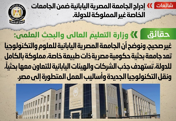 وتواصل مركز المعلومات مع وزارة التعليم العالى والبحث العلمى، بشأن حقيقة ادراج الجامعة المصرية اليابانية ضمن الجامعات الخاصة غير المملوكة للدولة.