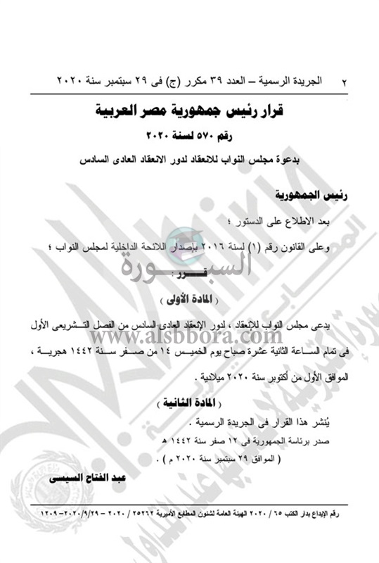 نشرت الجريدة الرسمية قرار الرئيس عبد الفتاح السيسى، رئيس الجمهورية، رقم (570) لسنة 2020 بدعوة مجلس النواب لافتتاح دور الانعقاد السادس من الفصل التشريعي الأول، في تمام الساعة الثانية عشرة صباح يوم الخميس 14 من صفر سنة 1442 هجرية، الموافق الأول من أكتوبر سنة 2020 ميلادية.