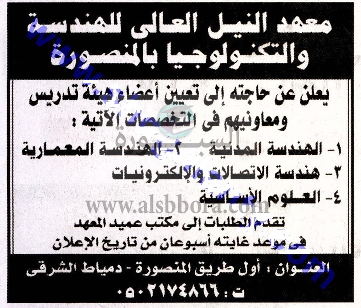 يعلن معهد النيل العالى للهندسة والتكنولوجيا بالمنصورة، عن حاجته الى اعضاء هيئة التدريس ومعاونيهم، وعلى الراغبين فى الحصول على الوظيفة تقديم الطلبات باسم عميد المعهد فى موعد غايته اسبوعين من تاريخ نشر الاعلان.