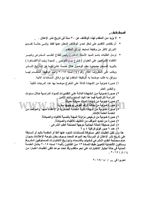 وعلي الراغبين في التقديم لإرسال طلبات باسم الدكتور / رئيس قطاع الطب الشرعى وكبير الاطباء الشرعيين على العنوان التالى -مصلحة الطب الشرعى - شارع بيرم التونسى - السيدة زينب - القاهرة بالبريد المسجل مصحوبا بعلم الوصول.