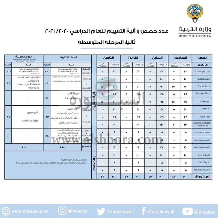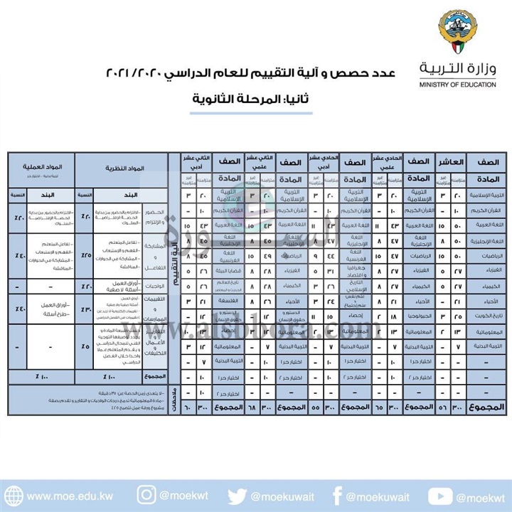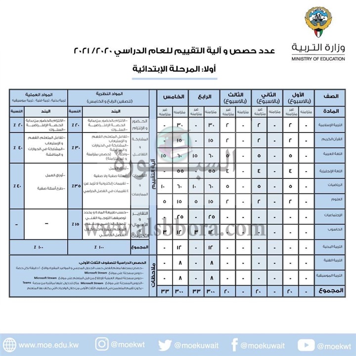 اعلنت وزارة التربية بدولة الكويت عن الخطة الدراسية وآلية التقييم لكل مرحلة والمعتمدة من اللجنة العليا للتعليم عن بعد، والتى جاءت كالتالى: