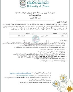 تعلن جامعة نزوى في سلطنة عُمان عن وظائف جديدة لأعضاء هيئة التدريس وفقا لنص الإعلان التالي:-