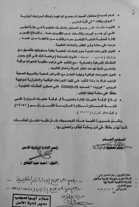 التنبيه مشددا على جميع العاماين بالمنشأت التعليمية فى حالة العثور على اى جسم غريب والاشتباه عدم الاقتراب منه والابلاغ الفورى لادارة الحماية المدنية للتعامل معه والتأكد من فاعليته من عدمه حرصا على سلامة وامن الطلاب والمنشأت التعليمية.