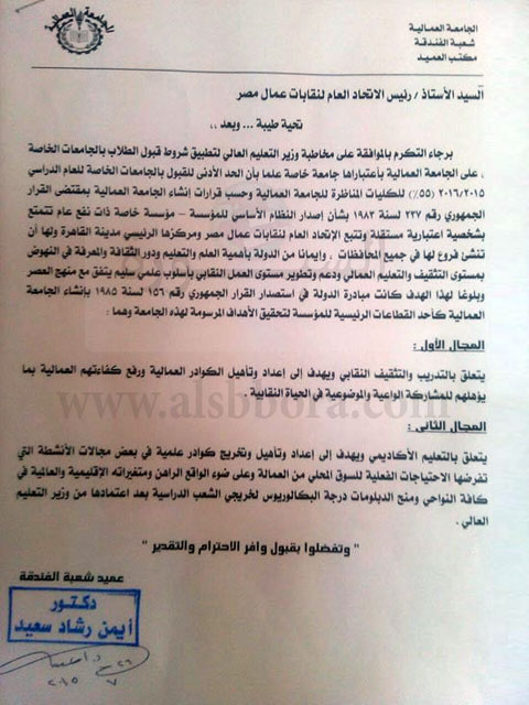 ولفتت الجامعة العمالية فى خطابها، إلي الاتحاد أن الحد الأدنى للقبول بالجمعات الخاصة للعام الدراسى 2015/2016 (55%) للكليات المناظرة للجماعة وحسب قرارات إنشاء الجامعة العمالية بمقتضى القرار الجمهورى رقم 237 لسنة 1983، بشأن إصدار النظام الأساسى للمؤسسة كمؤسسة خاصة ذات نفع عام تتمتع بشخصية اعتبارية مستقلة وتتبع الاتحاد العام لنقابات عمال مصر ومركزها الرئيسى مدينة القاهرة ولها أن تنشئ فروع لها فى جميع المحافظات.