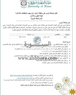 أعلت جامعة نزوى في سلطنة عُمان عن وظائف جديدة لأعضاء هيئة التدريس وفقا لنص الإعلان التالي:-