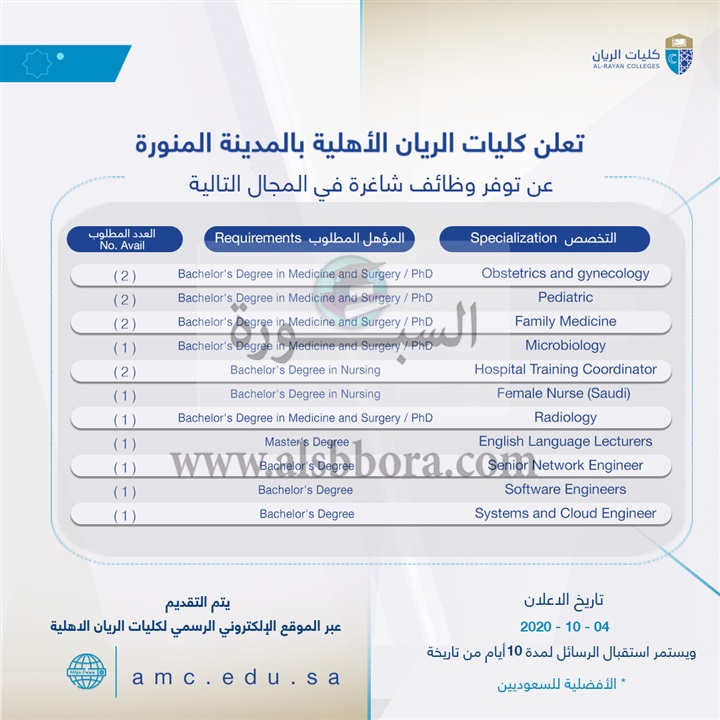 تعلن كليات الريان عن وظائف جديدة لأعضاء هيئة التدريس وفقا لنص الإعلان التالي: -