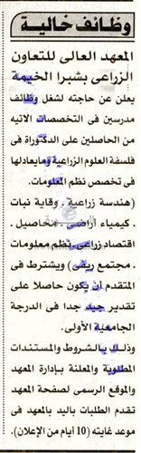 المعهد العالى للتعاون الزراعى يعلن حاجته الى اعضاء هيئة التدريس ومعاونيهم