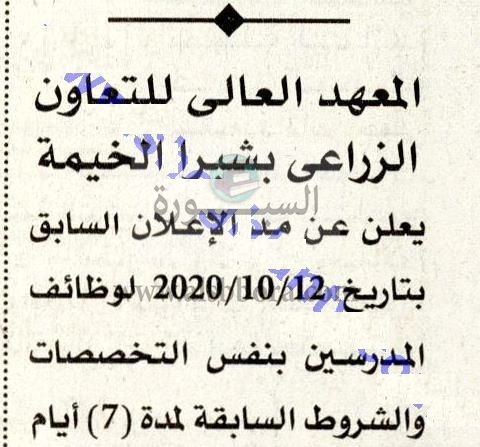 يعلن المعهد العالى للتعاون الزراعى عن حاجته الى اعضاء هيئة التدريس ومعاونيهم، وعلى الراغبين فى الحصول على الوظيفة تقديم الطلبات باسم عميد المعهد فى موعد غايته 7 ايام من تاريخ نشر الاعلان اليوم الاثنين الموافق 26 اكتوبر 2020.