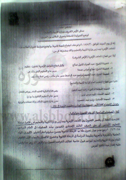 "اولا " الصفوف الدراسية التى يتم التحويل منها واليها اقترحت اللجنة انه يقتصر التحويل بين المعاهد الازهرية ومدارس وزارة التربية والتعليم من تلاميذ مرحلة التعليم الاساسى اى حتى الصف الثالث الاعدادى المقيدين لهذا العام الدراسى 2015 _2016 .