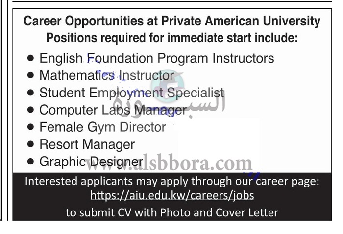 اعلنت الجامعة الامريكية بدولة الكويت الشقيقة حاجتها الى اعضاء هيئة التدريس ومعاونيهم، وعلى الراغبين فى الحصول على الوظيفة ارسال السيرة الذاتية عبر الايميل المنشور فى الاعلان التالى: