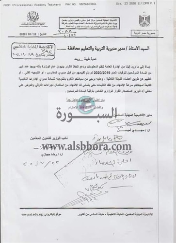 "يوجد عدد كبير من المرشحين لترقيات العام 2020/2019، لم يتم تقييمهم من قبل مديرى المدارس او التوجيه الفنى، او التقييم عن طريق اعضاء اللجنة الثلاثية وعليه يرجى من سيادتكم التكرم بالتوجه لمديرى الادارات التعليمية التابعة لسيادتكم سرعة الانتهاء من تلك التقييمات حتى يتسنى لنا الانتهاء من استكمال اجراءات الترقى والعرض على معالى الوزير لاستصدار القرار الوزارى الخاص بترقية المرشحين".