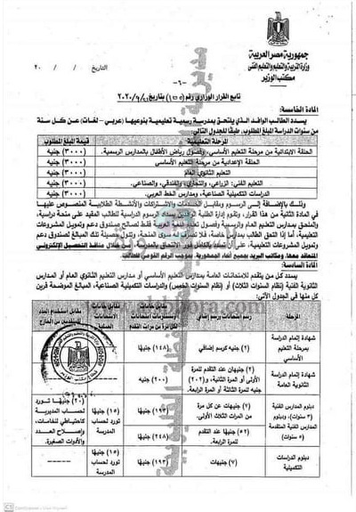 اعلنت وزارة التربية والتعليم والتعليم الفنى، عن رسوم سداد كل من يتقدم لامتحانات بمدارس التعليم الأساسى ومدارس التعليم الثانوى أو مدارس التعليم الثانوى الفنى بنظام 3 سنوات أو نظام 5 سنوات والدراسات التكميلية الصناعية على أن يتم توريد المبالغ المالية لصندوق دعم وتمويل المشروعات بالبريد أو فورى وتكون المصروفات للعام الدراسى 2020/ 2021 كالتالى: