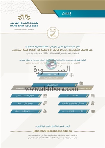أعلنت كليات الشرق العربي السعودية عن وظائف جديدة لاعضاء هيئة تدريسفي 8 كليات وفقا للإعلان الاتي:-