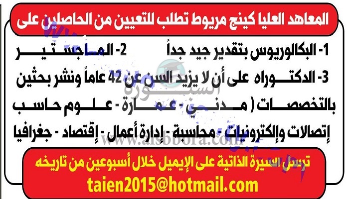 تعلن المعاهد العليا بكينج مريوط بمحافظة الاسكندرية عن حاجتها الى اعضاء هيئة التدريس ومعاونيهم، وعلى الراغبين فى الحصول على الوظيفة ارسال السيرة الذاتية عبر الايميل المنشور فى الاعلان التالى: