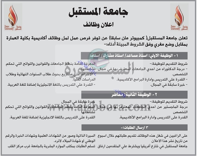 تعلن جامعة المستقبل بدولة السودان الشقيق عن حاجتها الى اعضاء هيئة التدريس ومعاونيهم، وعلى الراغبين فى الحصول على الوظيفة تقديم الطلبات على العنوان المنشور فى الاعلان التالى: