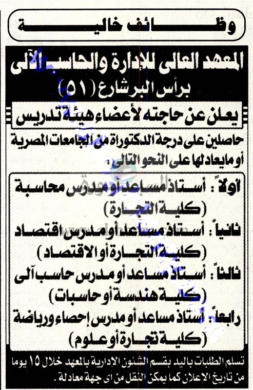 يعلن المعهد العالى للادارة والحاسب الالى برأس البر عن حاجته الى اعضاء هيئة التدريس ومعاونيهم، وعلى الراغبين فى الحصول على الوظيفة تقديم الطلبات باليد بقسم الشئون الادارية بالمعهد خلال 15 يوما من تاريخ الاعلان كما يمكن النقل من اى جهة معادلة.