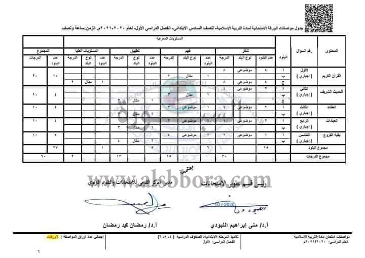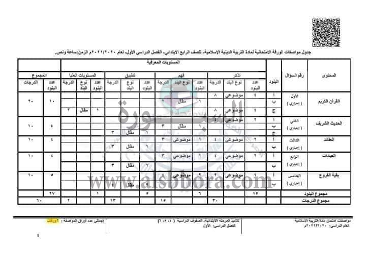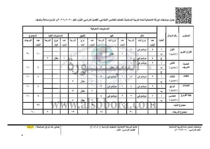 مواصفات الورقة الامتحانية لمادة التربية الدينية الاسلامية من الرابع الى السادس الابتدائي