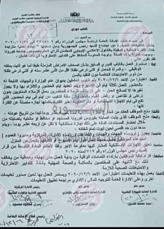 - منح الموظف الذي تثبت إصابته بكورونا أو مخالط أو مشتبه فيه، من خلال احضار المستندات الدالة، على ذلك إجازة استثنائية لا تقل عن ١٤ يوما يتم مدها دون حد أقصى لحين ثبوت تمام الشفاء.