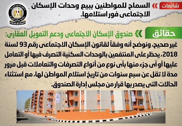 انتشر في بعض المواقع الإلكترونية وصفحات التواصل الاجتماعي أنباء حول السماح للمواطنين ببيع وحدات الإسكان الاجتماعي فور استلامها، وقد قام المركز الإعلامي لمجلس الوزراء بالتواصل مع صندوق الإسكان الاجتماعي ودعم التمويل العقاري، والذي نفى تلك الأنباء، مُؤكداً أنه لا صحة للسماح للمواطنين ببيع وحدات الإسكان الاجتماعي فور استلامها، مُوضحاً أنه وفقاً لقانون الإسكان الاجتماعي رقم 93 لسنة 2018، يحظر على المنتفعين بالوحدات السكنية التصرف فيها أو التعامل عليها أو أي جزء منها بأي نوع من أنواع التصرفات والتعاملات قبل مرور مدة لا تقل عن سبع سنوات من تاريخ استلام المواطن لها، مع استثناء الحالات التي يصدر بها قرار من مجلس إدارة الصندوق.