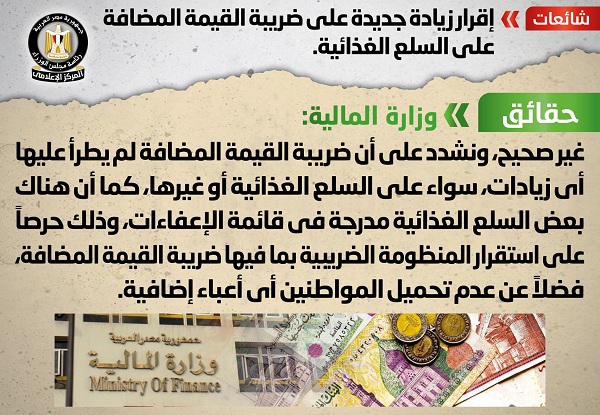 انتشر في بعض المواقع الإلكترونية وصفحات التواصل الاجتماعي أنباء بشأن إقرار زيادة جديدة على ضريبة القيمة المضافة على السلع الغذائية، وقد قام المركز الإعلامي لمجلس الوزراء بالتواصل مع وزارة المالية، والتي نفت تلك الأنباء، مُؤكدةً أنه لا صحة لإقرار أي زيادة جديدة على ضريبة القيمة المضافة على السلع الغذائية، مُشددةً على أن ضريبة القيمة المضافة لم يطرأ عليها أي زيادات، سواء على السلع الغذائية أو غيرها، كما أن هناك بعض السلع الغذائية مدرجة في قائمة الإعفاءات، وذلك حرصاً على استقرار المنظومة الضريبية بما فيها ضريبة القيمة المضافة، فضلاً عن عدم تحميل المواطنين أي أعباء إضافية.