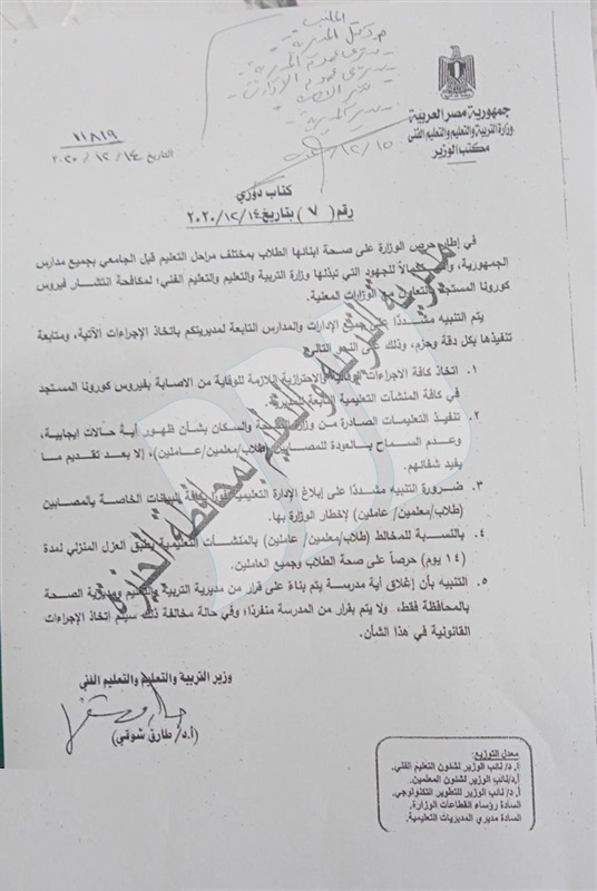 ارسلت وزارة التربية والتعليم والتعليم الفني، بقيادة الدكتور طارق شوقى، خطابًا جديدًا بشأن فيروس كورونا المستجد وطرق الوقاية منه، وآلية حماية الطلاب في المدارس المختلفة.