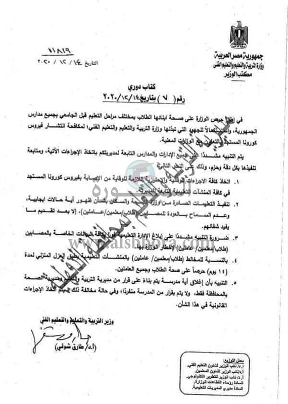 وأرسلت وزارة التربية والتعليم منشوراً لجميع المديريات التعليمية، تؤكد فيه إنه في إطار حرص الوزارة على صحة الطلاب بمختلف مراحل التعليم قبل الجامعي بجميع مدارس الجمهورية، واستكمالا للجهود التي تبذلها الوزارة لمكافحة انتشار فيروس كورونا المستجد، بالتعاون مع الوزارات المعنية.