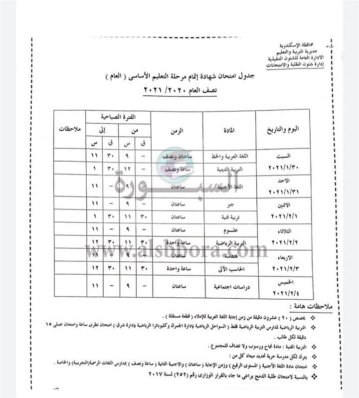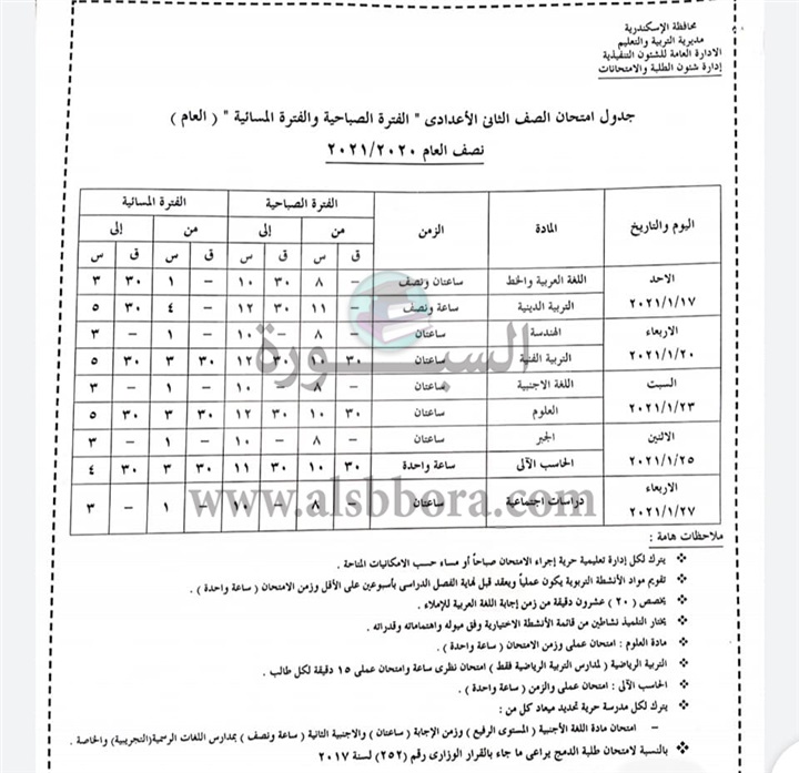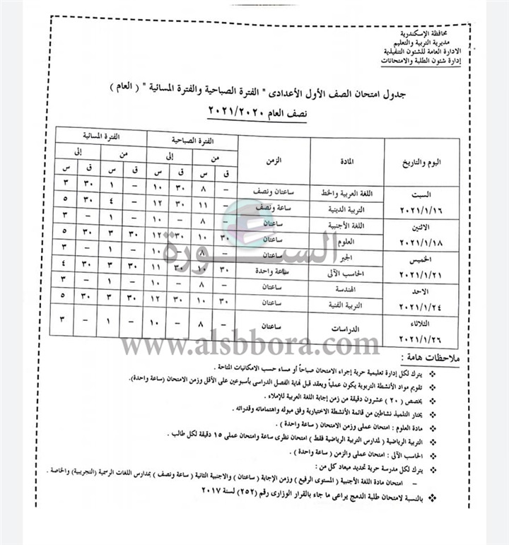 ننشر جداول امتحانات الصفين الاول والثانى والشهادة الاعدادية لمدارس الاسكندرية