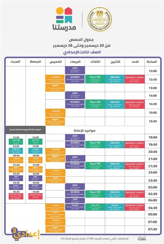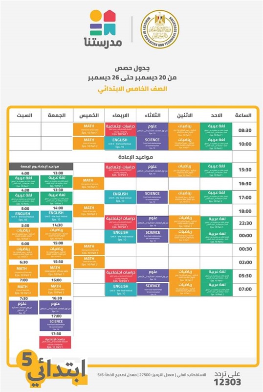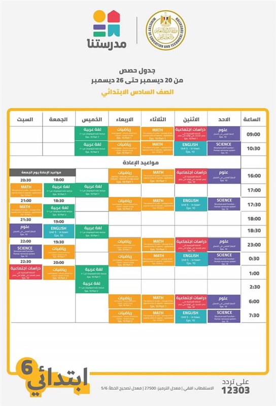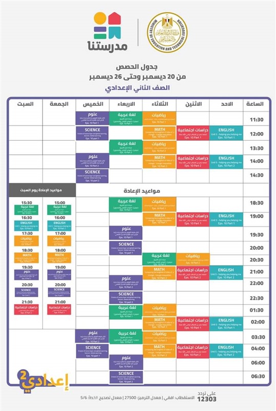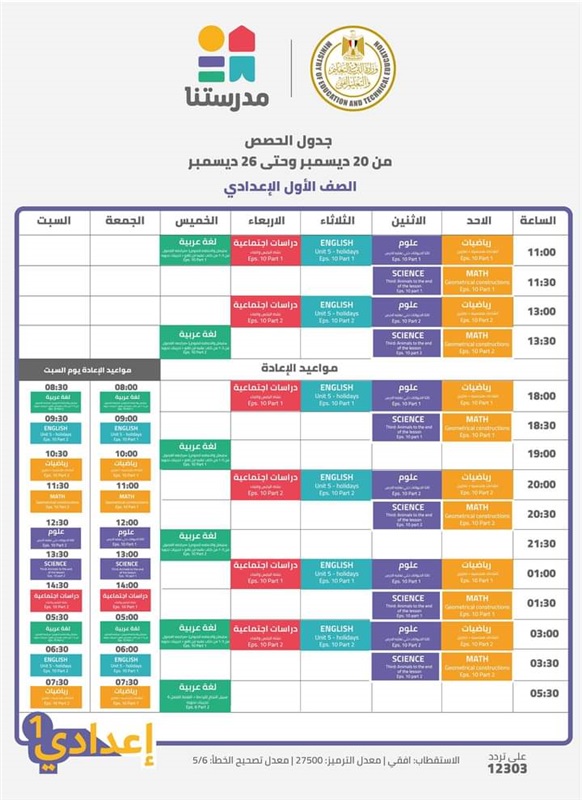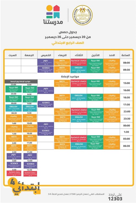 اعلنت وزارة التربية والتعليم والتعليم الفنى، عن جداول حصص القنوات التعليمية لجميع مراحل التعليم الاساسى من الصف الرابع الابتدائى الى الشهادة الاعدادية للعام الدراسى 2021/2020، والتى جاءت كالتالى: