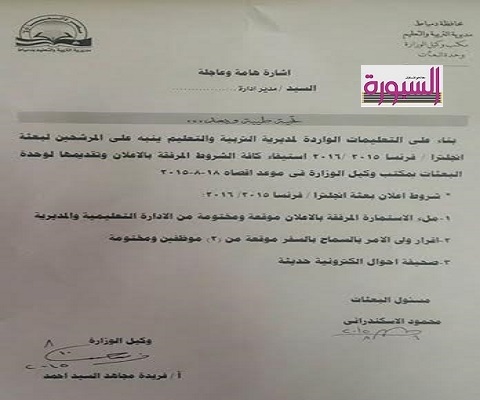 تحت عنوان اشارة هامة وعاجلة و بناءا علي التعليمات القادمة الي مديرية التربية والتعليم ، تنبة ادارة البعثات على المرشحين لبعثة انجلترا / فرنسا 2015 /2016 استيفاء كافة الشروط المرفقة بالاعلان وتقديمها لوحدة البعثات بمكتب وكيل الوزارة فى موعد اقصاه 18-8-2015