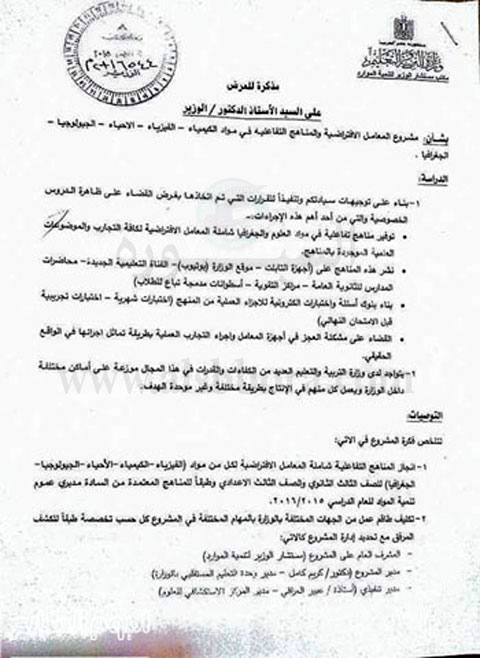وأوضحت المذكرة أنه سيتم توفير ما يسمى ببنوك الأسئلة وعقد اختبارات الكترونية للإجزاء العلمية من المنهج بطريقة تماثل اجرائها فى الواقع، حيث يتم القضاء على مشكلة العجز فى أجهزة المعامل. وأوضحت المذكرة أن الدكتور محب الرافعى وافق على تفرغ فريق العمل التنفيذى للمشروع لحين الإنتهاء منه فى 30 أكتوبر المقبل.