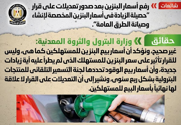 انتشر في بعض المواقع الإلكترونية وصفحات التواصل الاجتماعي أنباء بشأن رفع أسعار البنزين بعد صدور تعديلات على قرار "حصيلة الزيادة في أسعار البنزين المخصصة لإنشاء وصيانة الطرق العامة"، وقد قام المركز الإعلامي لمجلس الوزراء بالتواصل مع وزارة البترول والثروة المعدنية، والتي نفت تلك الأنباء، مُؤكدةً أنه لا صحة لرفع أسعار البنزين بعد صدور تعديلات على قرار "حصيلة الزيادة في أسعار البنزين المخصصة لإنشاء وصيانة الطرق العامة"، مُوضحةً أن أسعار بيع البنزين للمستهلكين كما هي، وليس للقرار تأثير على سعر البنزين للمستهلك الذي لم يطرأ عليه أية زيادات جديدة، وأن أسعار بيع الوقود تحددها لجنة التسعير التلقائي للمنتجات البترولية بشكل ربع سنوي، مُشيرةً إلى أن التعديلات على القرار لا علاقة لها نهائياً بأسعار البيع للمستهلكين.