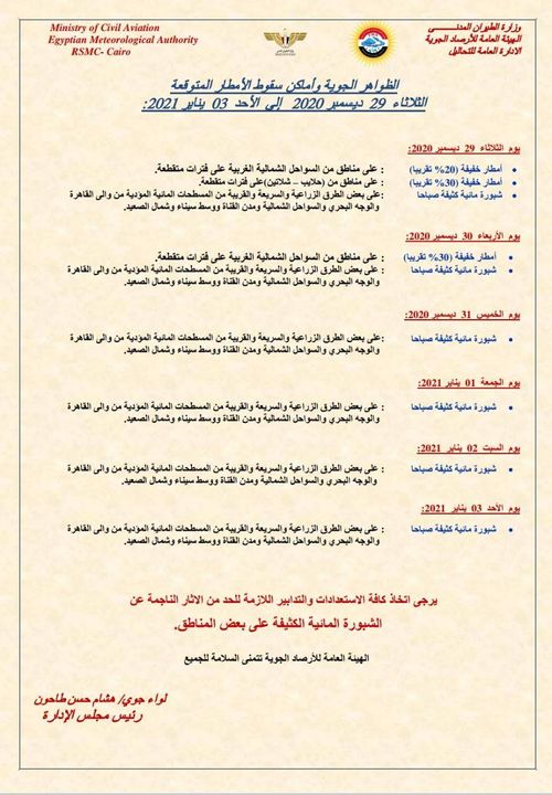 اعلنت هيئة الارصاد الجوية التابعة لمجلس الوزراء عن خراشط سقوط الامطار خلال الفترة المقبلة بدء من الغد الثلاثاء الموافق 29 ديسمبر الى يوم الاحد المقبل الموافق 3 يناير 2021.
