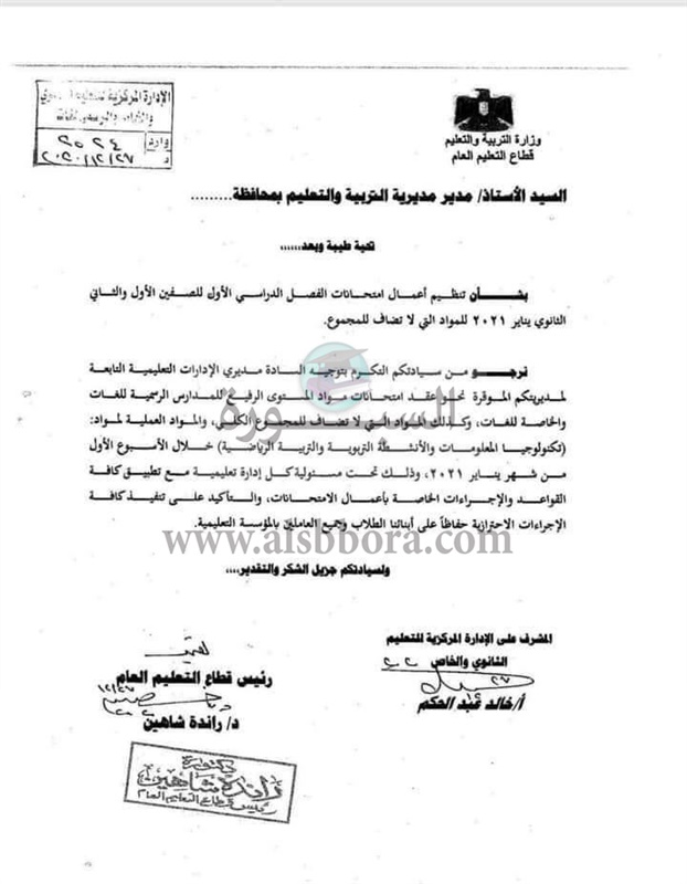 تعليمات تنظيم أعمال امتحانات الفصل الدراسي الاول للصفين الاول والثاني الثانوي يناير ٢٠٢١ للمواد التى لا تضاف للمجموع لجميع المدارس الثانوية
