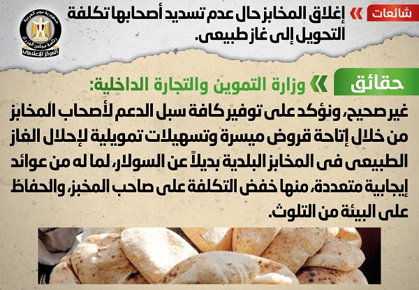 انتشر في بعض المواقع الإلكترونية وصفحات التواصل الاجتماعي أنباء بشأن إغلاق المخابز حال عدم تسديد أصحابها تكلفة التحويل إلى غاز طبيعي، وقد قام المركز الإعلامي لمجلس الوزراء بالتواصل مع وزارة التموين والتجارة الداخلية، والتي نفت تلك الأنباء، مُؤكدةً أنه لا صحة لإغلاق المخابز حال عدم تسديد أصحابها تكلفة التحويل إلى غاز طبيعي، مُوضحةً توفير كافة سبل الدعم لأصحاب المخابز من خلال إتاحة قروض ميسرة، وتسهيلات تمويلية لإحلال الغاز الطبيعي في المخابز البلدية بديلاً عن السولار، لما له من عوائد إيجابية متعددة، منها خفض التكلفة على صاحب المخبز، والحفاظ على البيئة من التلوث.